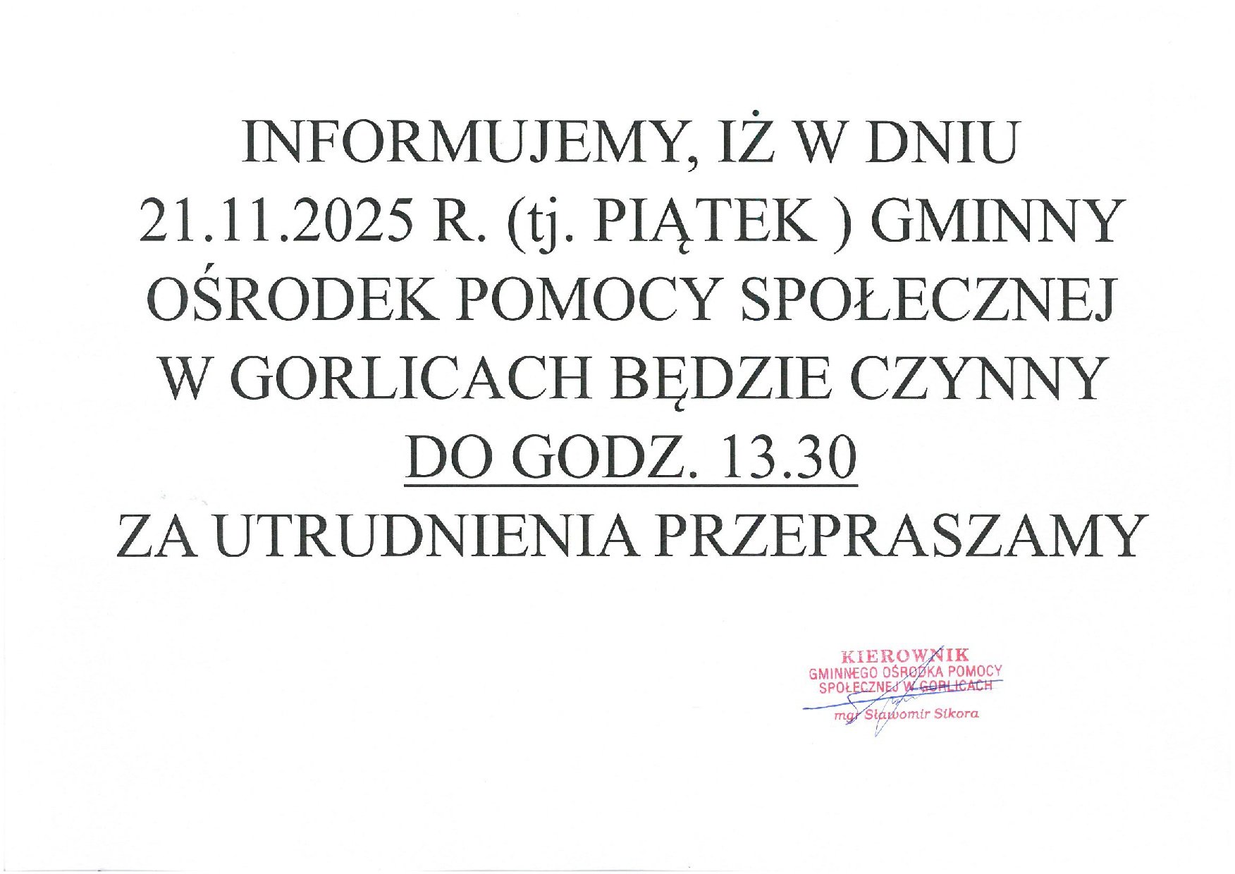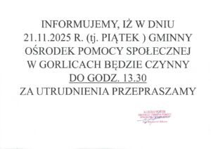 Informujemy, iż w dniu 21.11.2025 r. (piątek) Gminny Ośrodek Pomocy Społecznej w Gorlicach