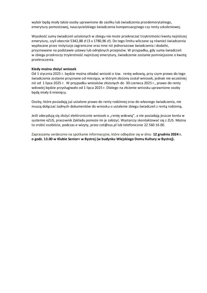 Spotkanie informacyjne odbędzie się w dniu 12 grudnia 2024 r. o godz. 13.00 w Klubie Senior+ w Bystrej (w budynku Wiejskiego Domu Kultury w Bystrej).